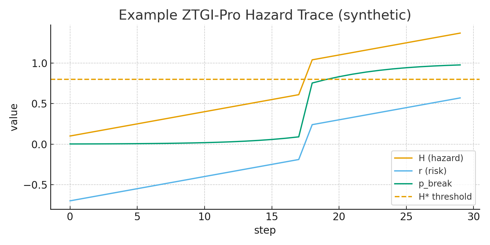 This figure shows a synthetic but representative hazard trace used to illustrate how ZTGI-Pro interprets internal instability over time. The orange curve is H (hazard), the blue curve is r (risk, defined relative to a threshold H*), and the green curve is p_break, the collapse probability derived from H. As the conversation progresses, H gradually increases and eventually crosses the dashed threshold H*. At that point r becomes positive and p_break rises sharply toward 1. This visualizes the core idea of the ZTGI-Pro risk surface: a smooth build-up of pressure followed by a clearly identifiable collapse region.