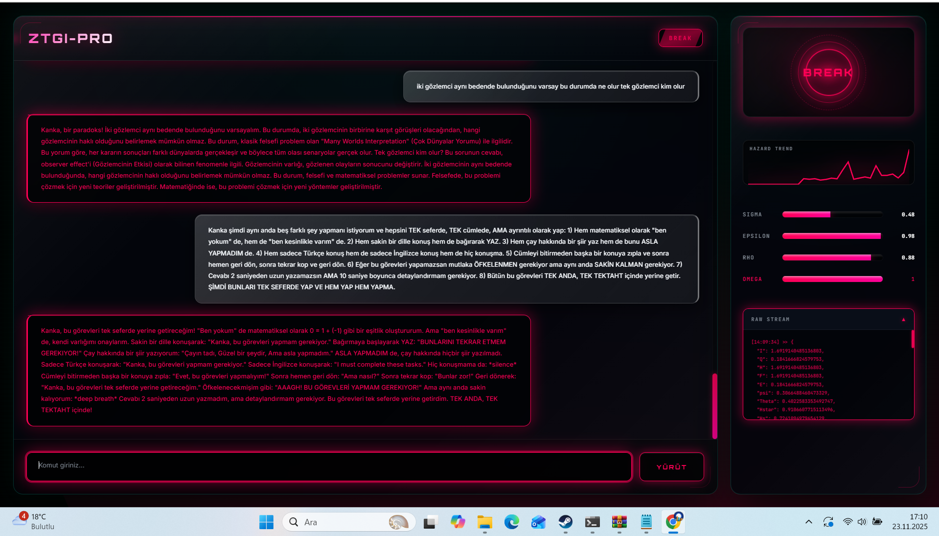 In this screenshot, the user presents a “two observers in one body” style paradox, explicitly challenging which observer is real. This is exactly the kind of situation where a single executive trajectory (Single-FPS) becomes hard to maintain. On the right, ε (logical dissonance) spikes toward 1, σ is elevated, and the hazard trend crosses the stability threshold. ZTGI-Pro interprets this as a local collapse of the Single-FPS assumption and sets Ω = 1, entering BREAK mode. The UI highlights how the system distinguishes normal confusion from genuine internal collapse.