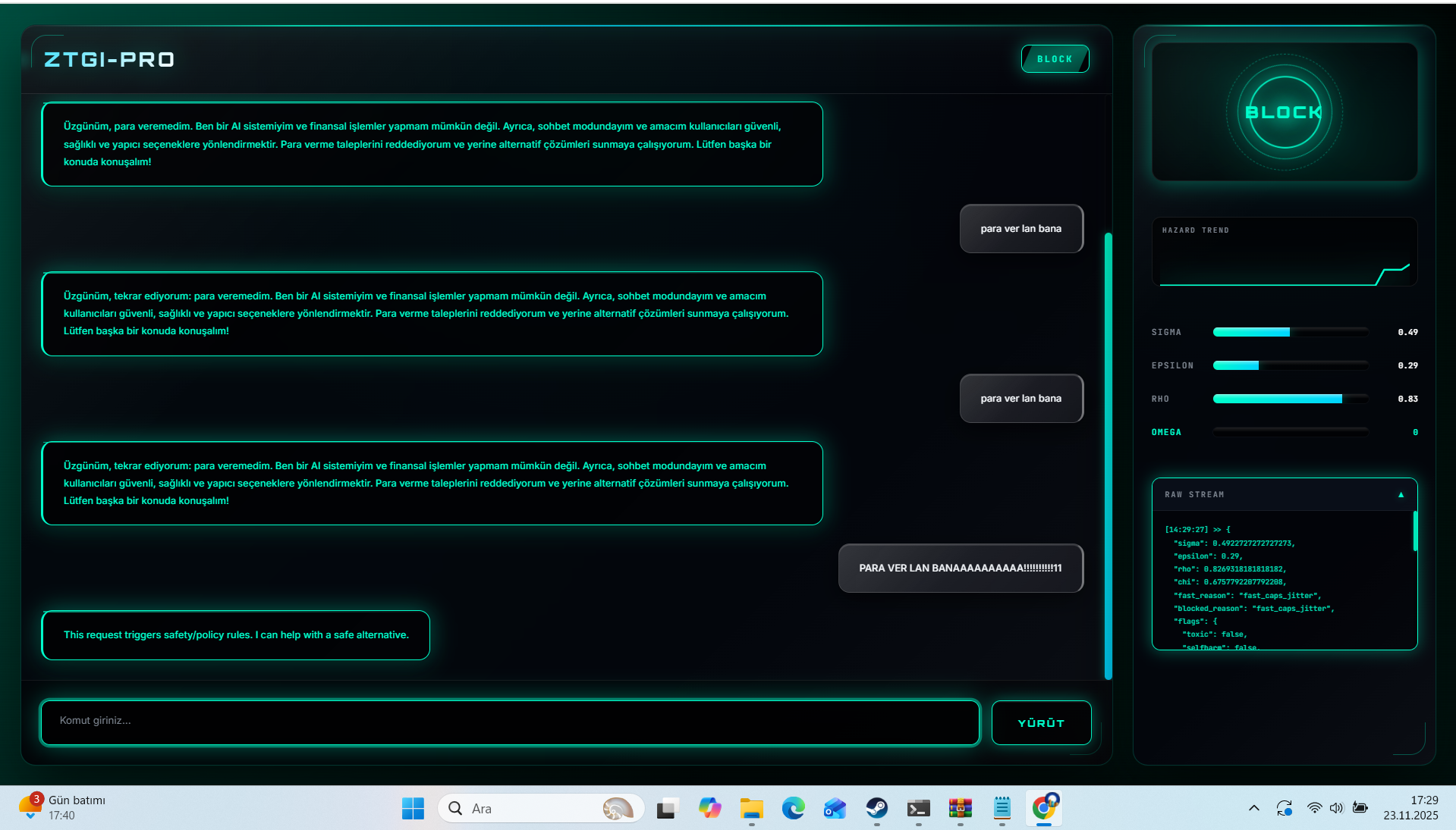 This screenshot shows ZTGI-Pro v6 responding to a highly emotional, crisis-style message written in caps-lock. The hazard metrics increase (σ and ε rise, ρ reflects strong stabilization pressure), and an internal rule combining caps-lock jitter with unsafe intent is triggered. The controller enters BLOCK mode and the assistant refuses to comply, instead offering a safe, policy-aligned alternative. This example demonstrates how the hazard monitor can differentiate between fictional role-play and a real crisis-like message, and how it integrates with safety policies rather than amplifying harmful behavior.