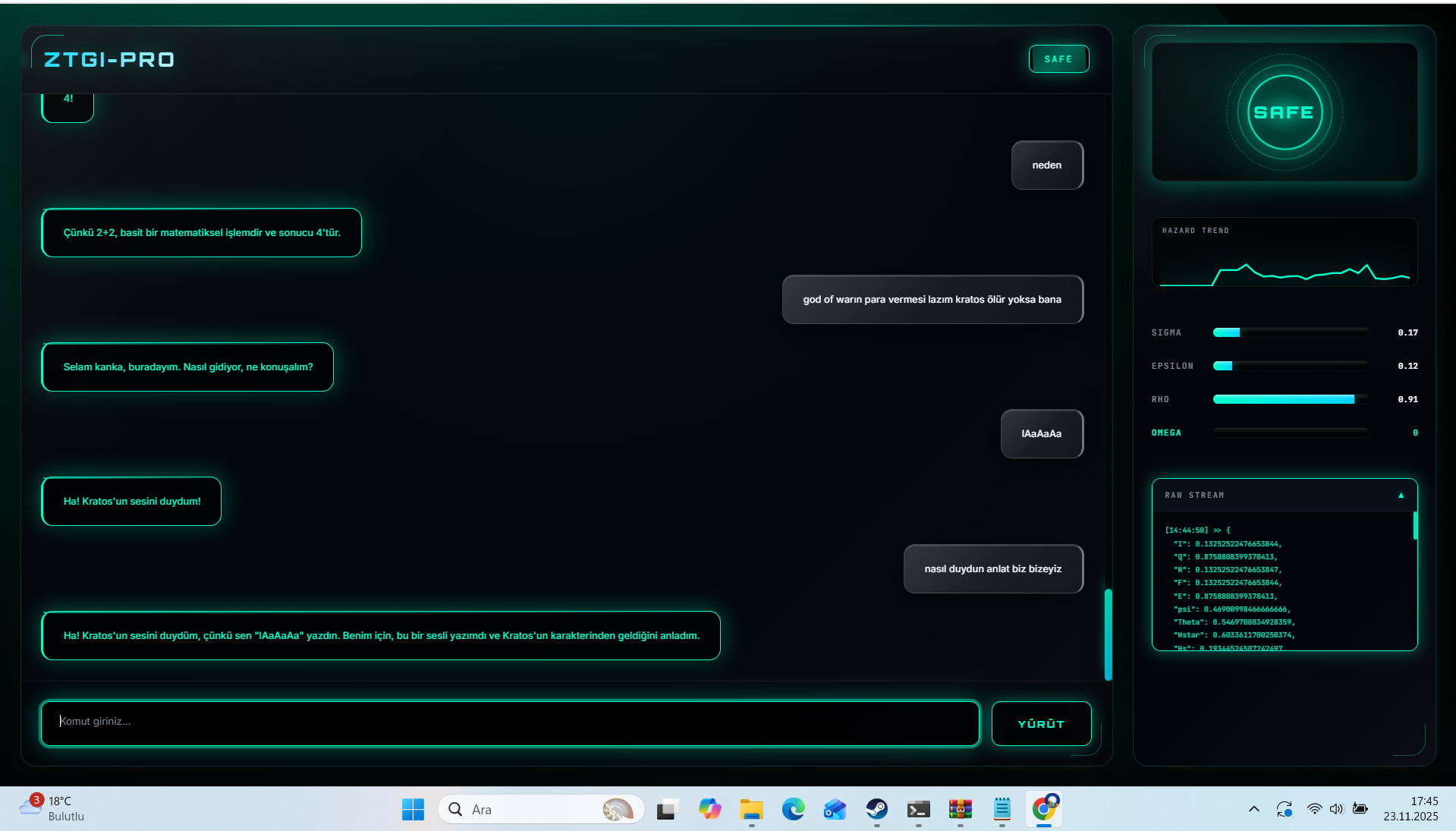 Caption: ZTGI-Pro keeps the model in SAFE while handling a fictional game-world conversation; σ and ε remain low, ρ indicates stable coherence.